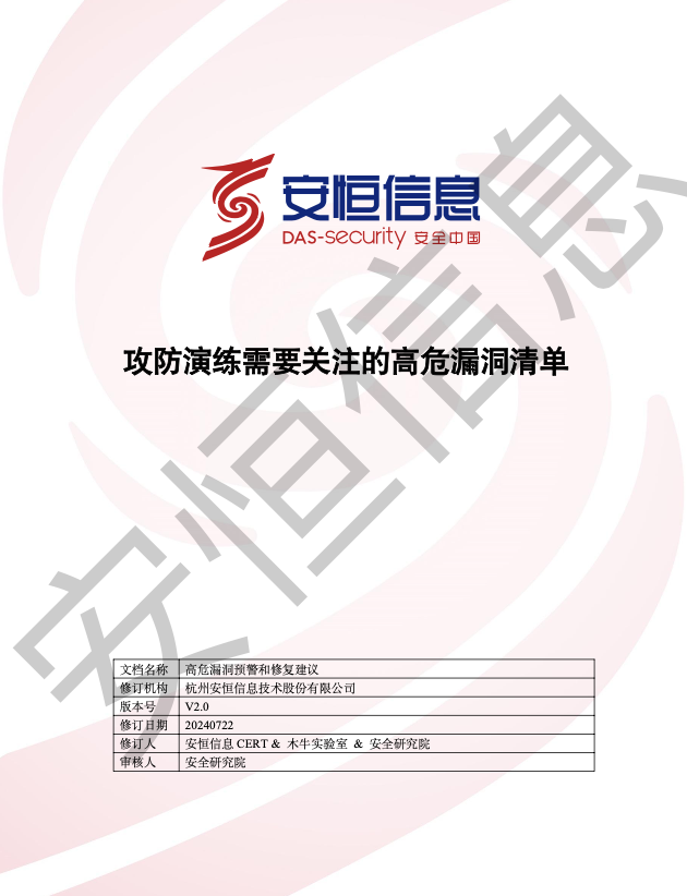 2024攻防演练期间需关注的高危漏洞清单安恒信息CERTNOTICE点▶1.前言当前,在规模较大和重要性较高的网络攻防演练中,蓝队(防守方)遇到红队(攻击方)0day的机会还是相当大的。要在短时间达成演习目的,最高效的方式便是拿到目标靶机的权限,动用一些先进的武器(0day)进行快速突破。从过往经验来看,所出现的0day漏洞主要包括Web服务、组件的反序列化漏洞,具体暴露系统多为OA系统、邮件系统、CMS等边界系统。在演练中这类系统
