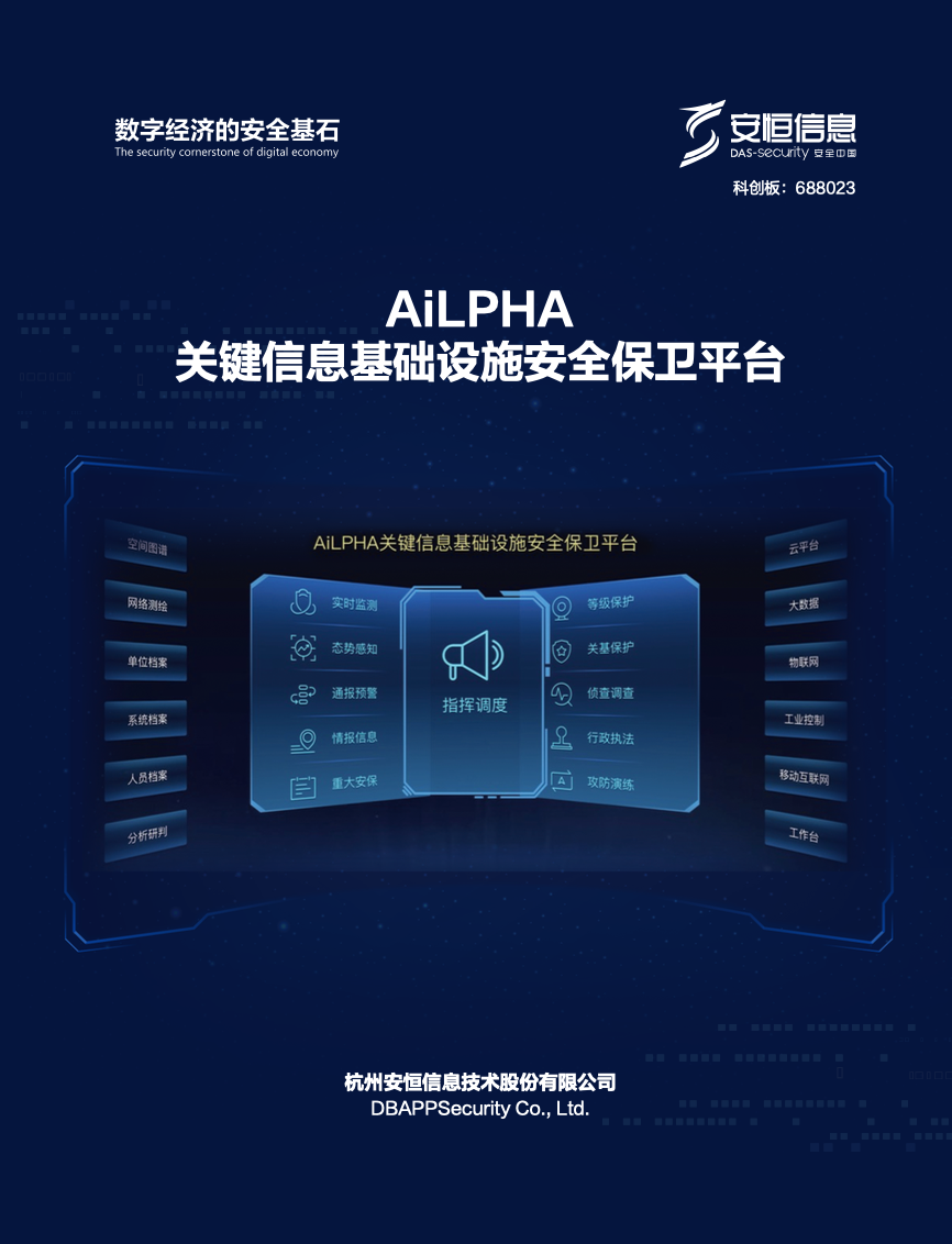 产品概述AiLPHA关键信息基础设施安全保卫平台在网络安全等级保护制度和关键信息基础设施安全保护制度基础上,结合国家网络安全监管部门发布的相关政策指引下研制并开发的一款具备实时监测、威胁感知、通报预警和指挥调度等11个业务模块与11个基础库功能的综合安全事件分析与全局安全态势感知平台。平台按照法律法规和有关国家标准规范,充分利用人工智能、大数据分析等技术,积极落实网络安全管理和技术防范措施,强化网络安全监