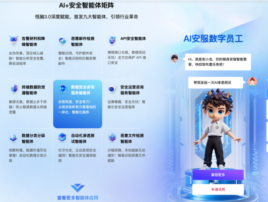 业内首个落地的自主安全智能体(AI Agent),预置数百个原子级安全智能体,革命性采用任务驱动多智能体协同模式。