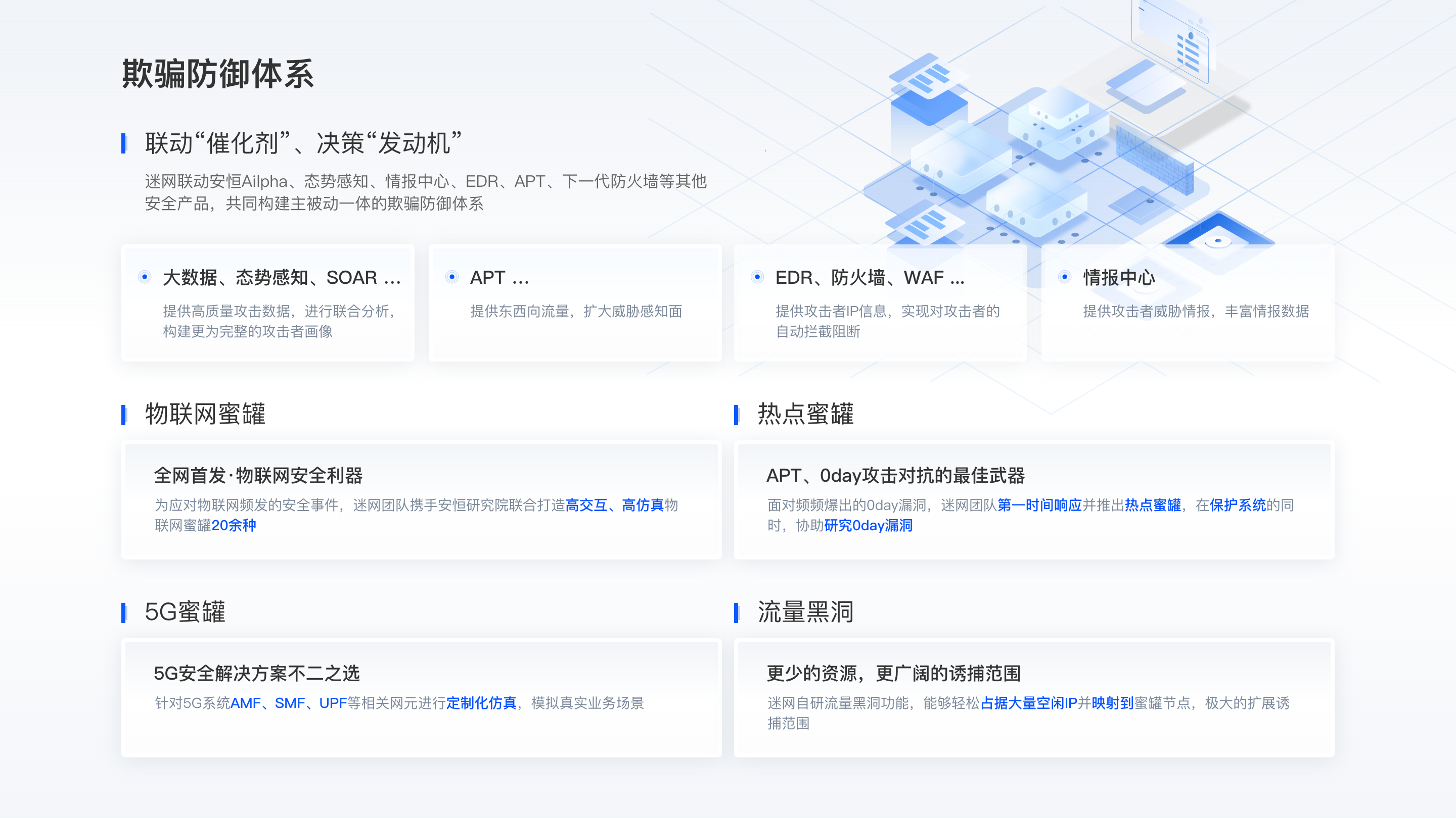 明鉴®迷网系统(以下简称“迷网”)是安恒信息根据多年在安全领域的攻防经验,基于蜜罐、蜜饵等欺骗技术,打造的一款实战化欺骗诱捕防御产品。迷网践行“欺骗防御体系构建”理念,利用自身技术特性,联动Ailpha、态势感知、情报中心、EDR、APT、下一代防火墙等产品共同构建主被动一体的欺骗防御体系,让安全运营更有成效!