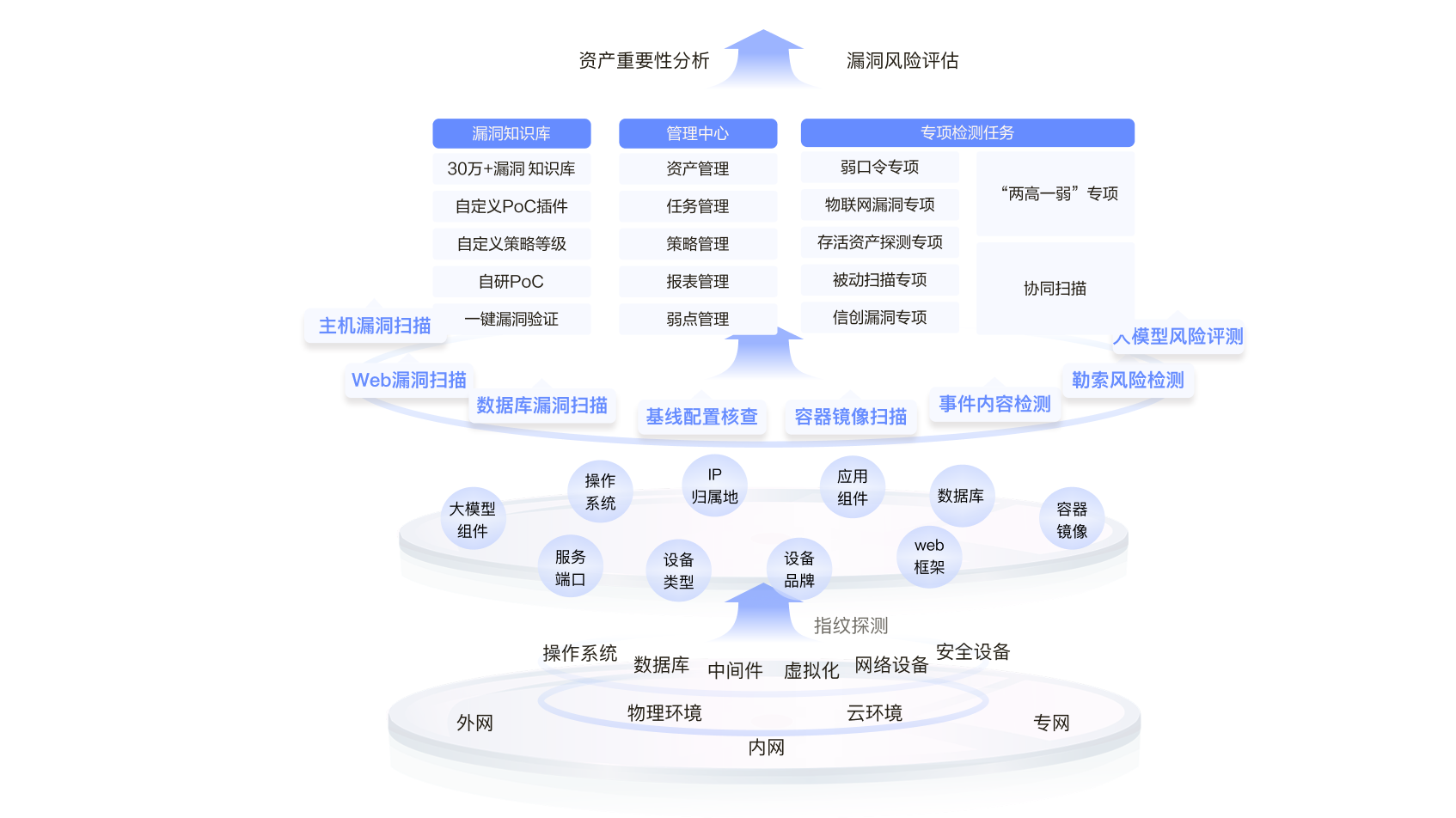 创新协同扫描模式,一键完成资产探测、主机与 Web 漏洞扫描,实现 “资产-漏洞-风险” 关联分析,显著提升复杂网络环境的检测效率与覆盖率