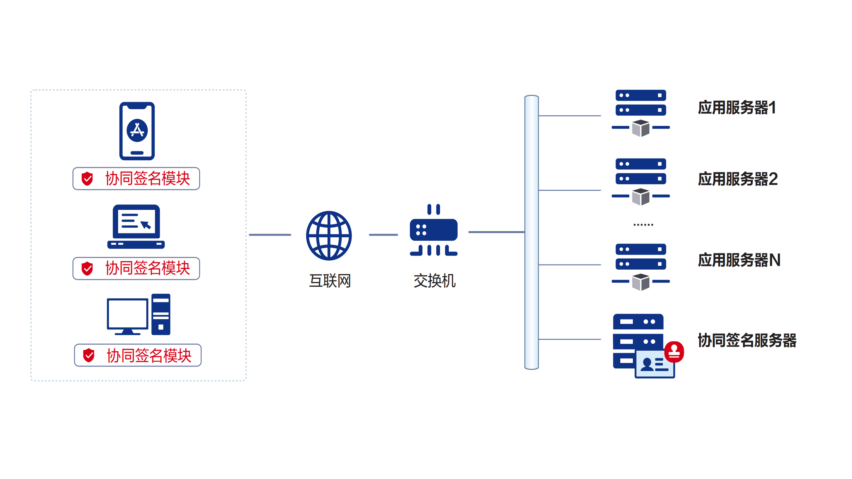 协同签名模块可在各类终端、应用系统中集成部署,支持iOS、Android终端;支持Windows、Linux操作系统多 种内核版本。