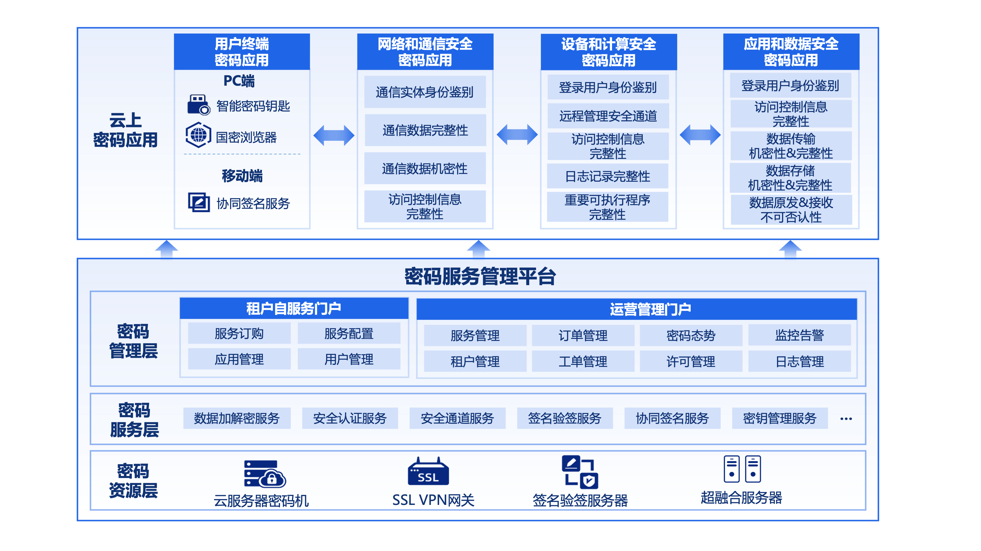 提供密码服务状态监控、统计分析、租户管理等多种管理功能,满足平台管理员、云租户两类角色对于基础运维、业务管理、平台运营等管理需求。