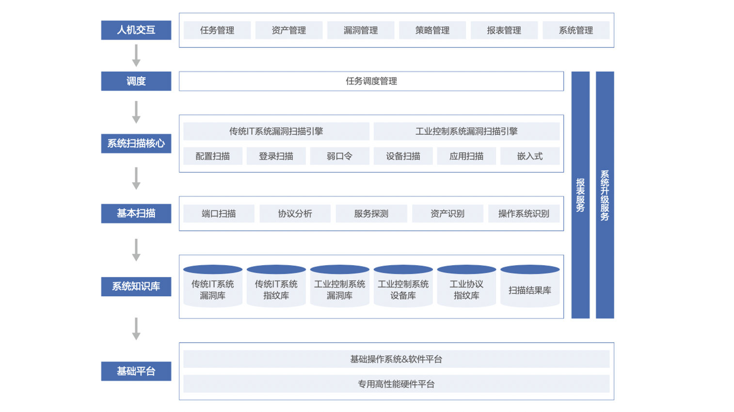 同时具备对OT与IT资产的漏洞扫描能力,包括支持传统IT资产的操作系统、服务、网络设备、WEB应 用、数据库、中间件等、Vxworks、eCos、QNX等嵌入式操作系统的漏扫扫描与配置核查。