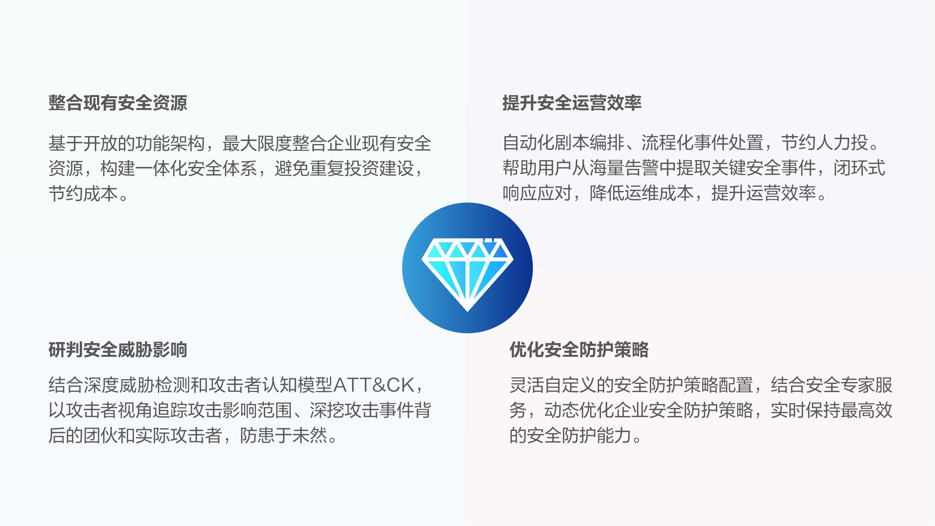 AiLPHA安全分析与管理平台(又称为:AiLPHA大数据智能安全平台)是一款结合大数据技术和人工智能算法的安全运营系统。采用业界领先的大数据分析技术架构和自研AI深度感知引擎,运用用户实体行为分析、安全编排与自动化响应、多维态势感知等技术为企业级用户提供全局安全态势感知能力, 保障其业务不间断稳定运行。 平台部署在用户侧, 通过威胁发现、智能研判和自动化响应处置的流程,提高安全运维工作效率,构建智能安全运营体系,实现安全运营的闭环管理,致力于让安全更智能,更简单。该产品已广泛应用于政府、金融、运营 商、公安、军工、电力能源、税务、工商、社保、交通、卫生、教育等各企事业单位。
