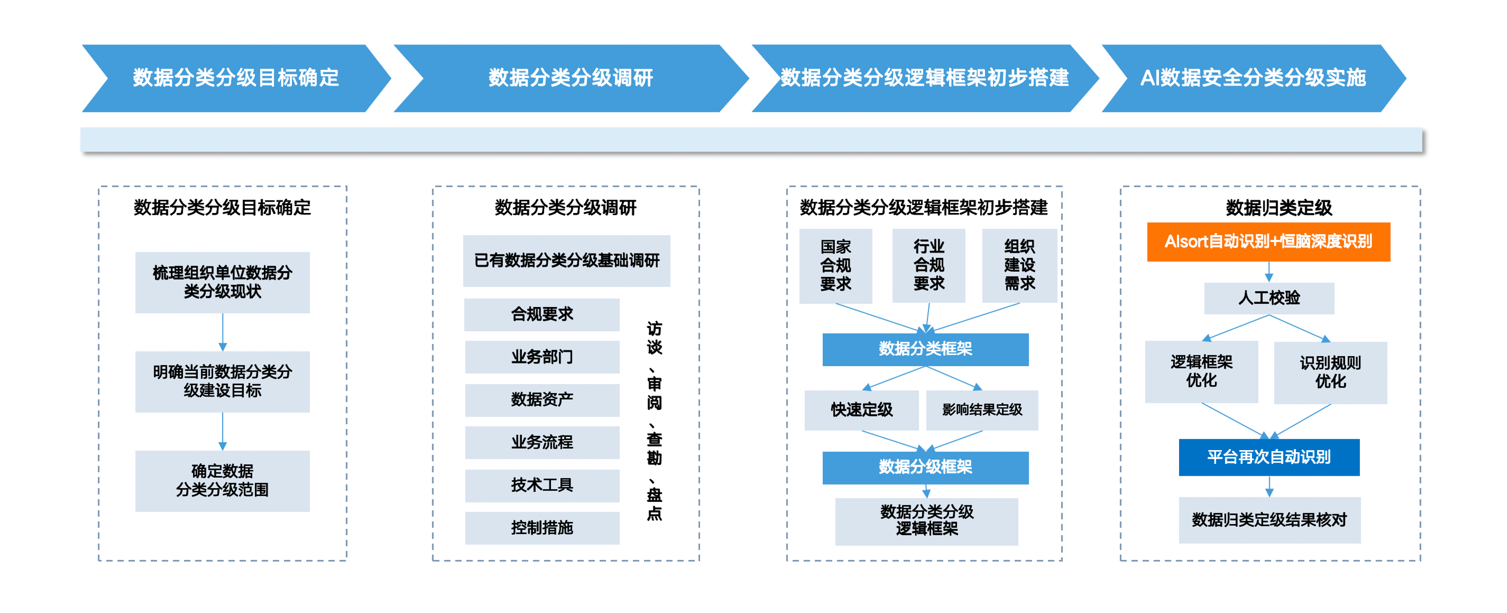 确定分类分级目标与范围、调研业务需求与基础信息、优化分类分级逻辑框架并同步至AI、AI自动化完成分类分级