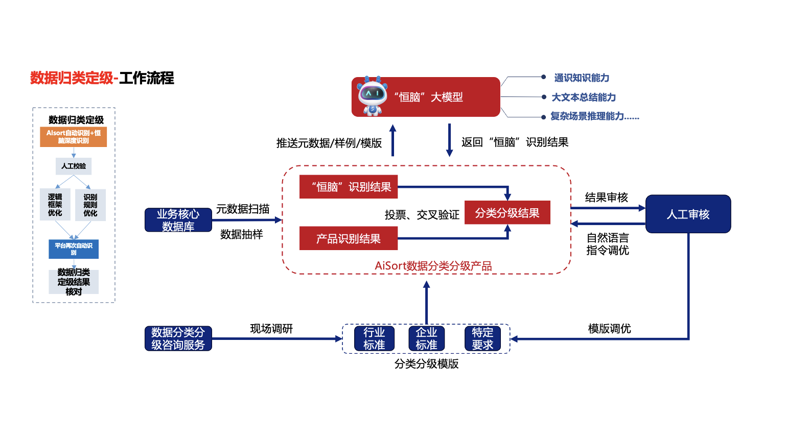 将传统“人工+工具“的分类分级模式升级为“AI+工具一体”模式,即通过“恒脑”大模型代替传统人工,进行分类分级字段的打标。