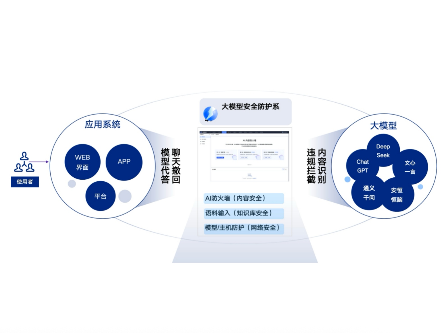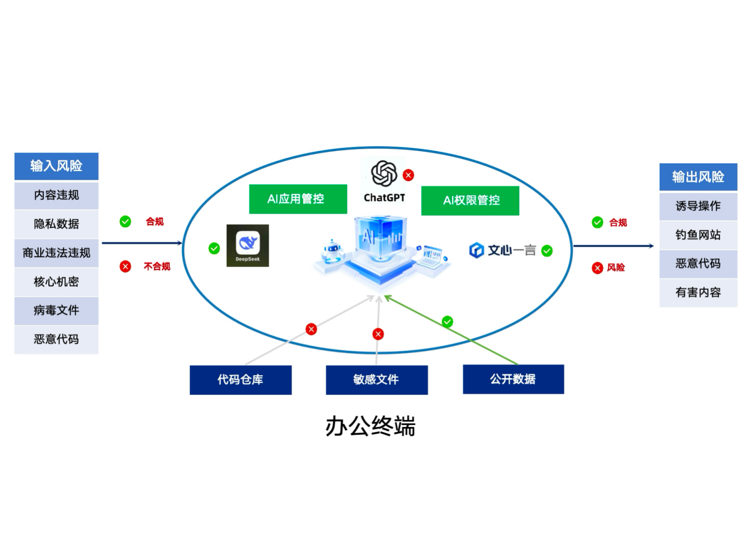 在输入阶段对提示词进行评估,防止生成非法结果;在输出阶段对模型生成的内容进行违规检测,及时阻断非法内容输出和事后审计。